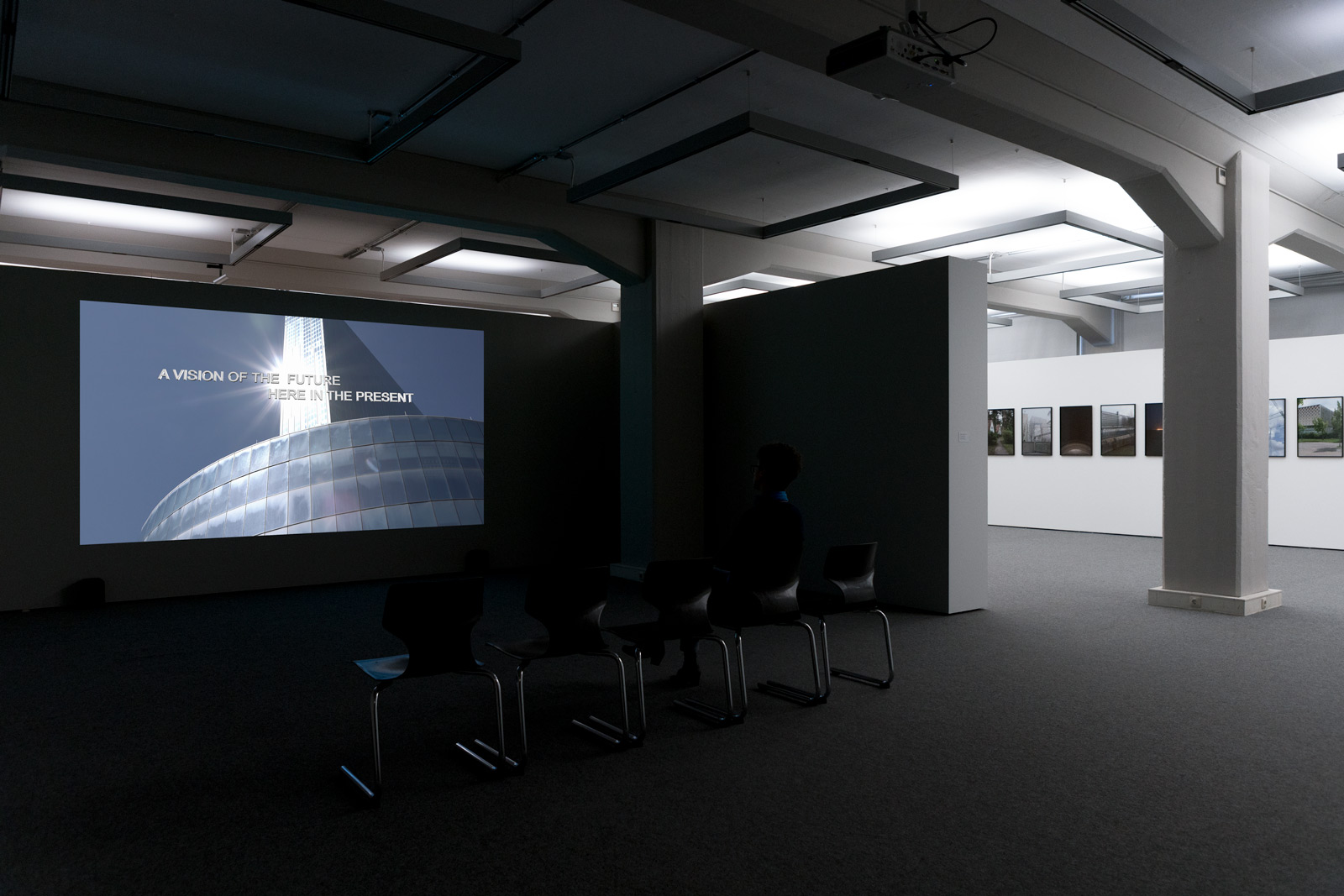 […] Wie gesagt, weit und breit nichts zu sehen von einer romantischen Vorstellung. Doch wo soll sie auch zu Hause sein heutzutage? Jedenfalls nicht in Goldbachs Arbeiten. Seine Videotrilogie atmet Endzeit, jegliche menschliche Aktivität im Film wird in der Postproduktion entfernt – wie in Boulevard de l’Europe, dessen Aufnahmen rund um die Absperrungen auf der französischen Seite des Euro-tunnels entstanden. Dort, wo auch zahlreiche Flüchtlinge ihr schwankendes Glück gen Großbritannien wagten. Doch die muss sich der Betrachter dazu denken. Goldbach zeigt lediglich die aufgerüstete, abweisende Sicherheitsarchitektur. Und alles, was sich bewegt, tut das nur wegen des Windes: das kräuselnde Meer, dürres Gestrüpp, rotierende Windräder. Ähnlich und doch anders ist Goldbachs Ausflug an die amerikanische Küste nach Atlantic City. In dem Spielerparadies sollte ein neuer Riesenkomplex aus Hotel und Casino entstehen: Revel. Dafür musste die kleinteilige Bebauung in Ufernähe weichen. Aber der Gigant mit Glasfassade, in den fast 2,5 Milliarden Dollar geflossen waren, steht leer. Eine Investruine. Vor dem sarkastisch wirkenden postkartenblauen Himmel kreischen nur die Möwen, sonst herrscht Ruhe. Nutzlos alles, wie der abgesperrte Eingangsbereich. Security patrouilliert dennoch im dunklen SUV. Selbst die Leere muss bewacht sein. Und schließlich umrundet Goldbach auch die Dresdner Chipfabrik. So stellt er dem Foto-porträt aus dem Inneren die Aufnahmen von außen gegenüber. Dabei hinterfragt er die Funktion des Ganzen wie auch des Einzelnen in diesem Gefüge. und greift dafür auf einen ungewöhnlichen Stichwortgeber zurück: Marvin, den depressiven Roboter aus Douglas Adams’ „Per Anhalter durch die Galaxis“. Dessen legendär gewordene Aussagen wie „Soll ich mich in eine Ecke setzen und vor mich hinrosten, oder soll ich gleich hier auseinanderfallen?“bringt Goldbach virtuell ins Bild (auf Englisch). Und wirft damit plötzlich doch einen sehr romantischen Gedankengang ein: den des Vergänglichen […]. Auszug aus: Torsten Klaus, "Keine Romantik, bitte", Dresdner Neueste Nachrichten, 14 November 2017 VIDEO EXCERPT EXHIBITION VIEWS